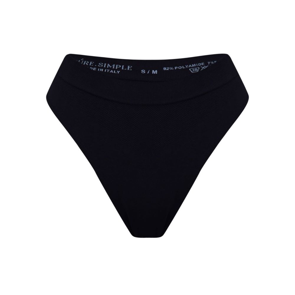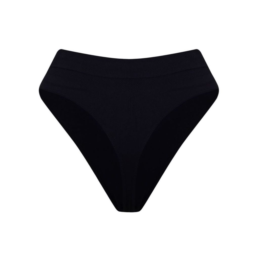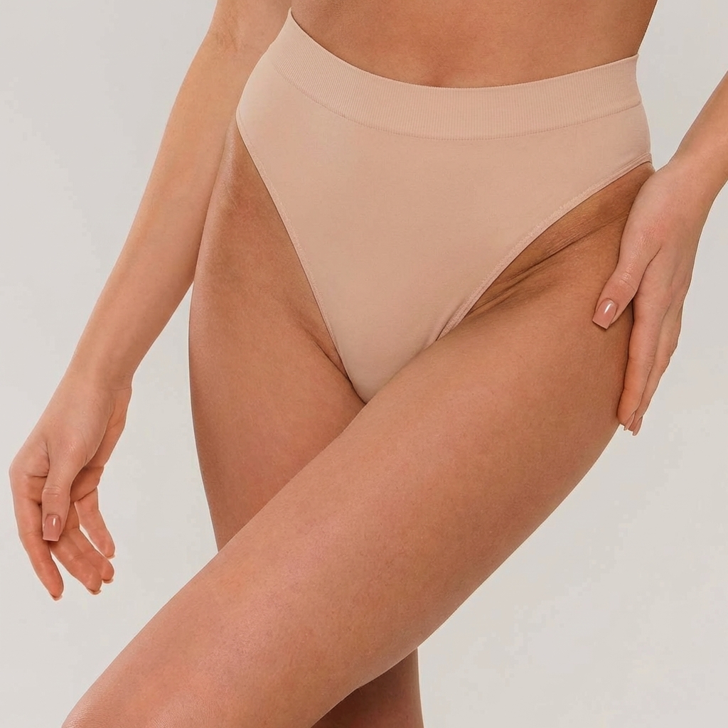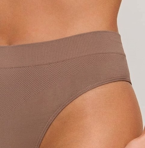 Chiloți-thong cu talie înaltă din capsulă Basic Linjerie este realizat folosind tehnologia modernă fără cusături din microfibră mătăsoasă. Chiloții dezvăluie maxim fesele; este completat de o căptușeală igienică din bumbac. Banda elastică complet tricotată dintr-o țesătură mai densă cu nervuri fine.