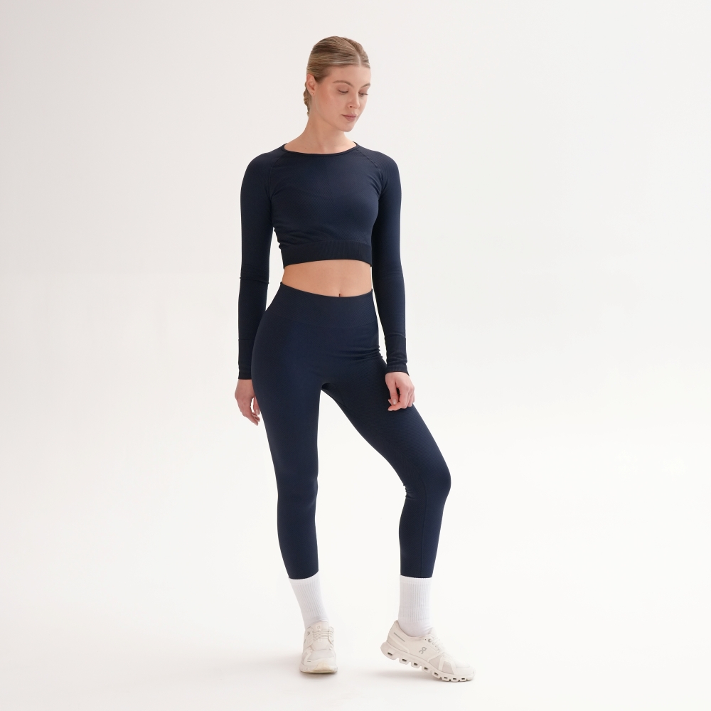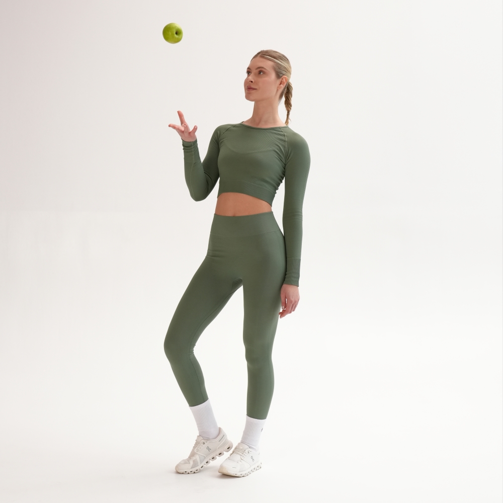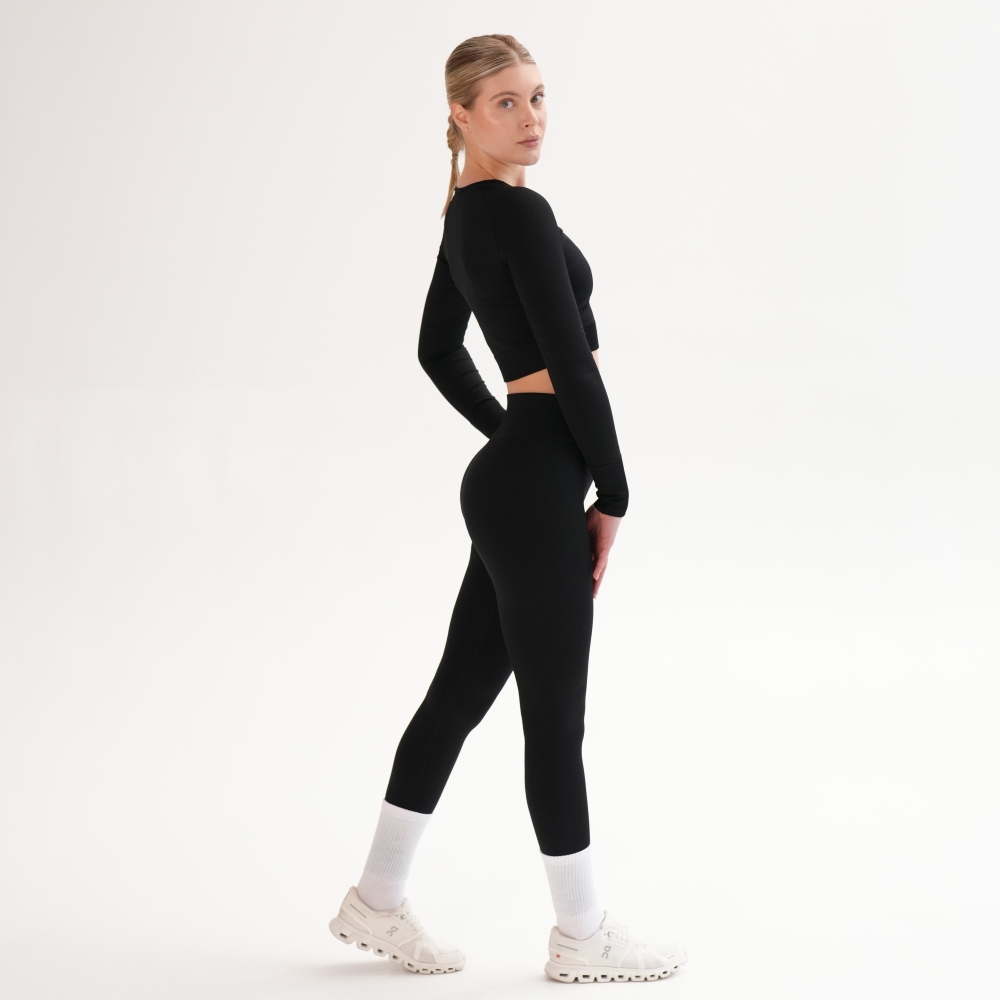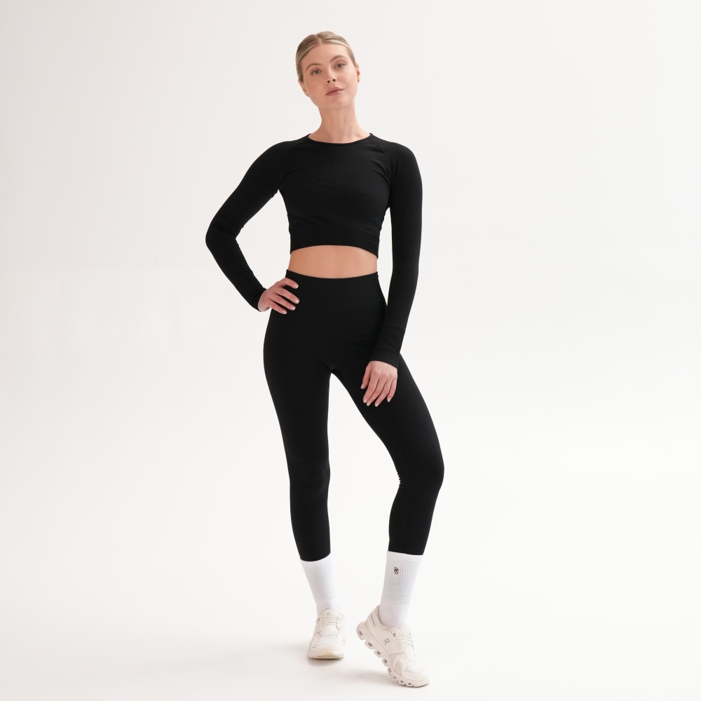 Leggings reiați pe diagonală din capsulă Rib perfection, realizați după tehnologie modernă fără cusături pe laterale. Pentru îmbunătățirea posturii, bată lată din exterior este realizată cu textură reiată și completată de o inserție triunghiulară, care îngustează vizual talia. Cusăturile exterioare sunt realizate folosind o tehnologie specială pentru a rezista suprasolicitărilor funcționale. Leggings au efect de modelare și corecție, alungind vizual picioarele și subliniind avantajele. Combinați leggings cu crop-top din aceeași capsulă și textura identică pentru look-uri monocrome sau cu crop-top din capsulă Flat harmony pentru look-uri accentuate.