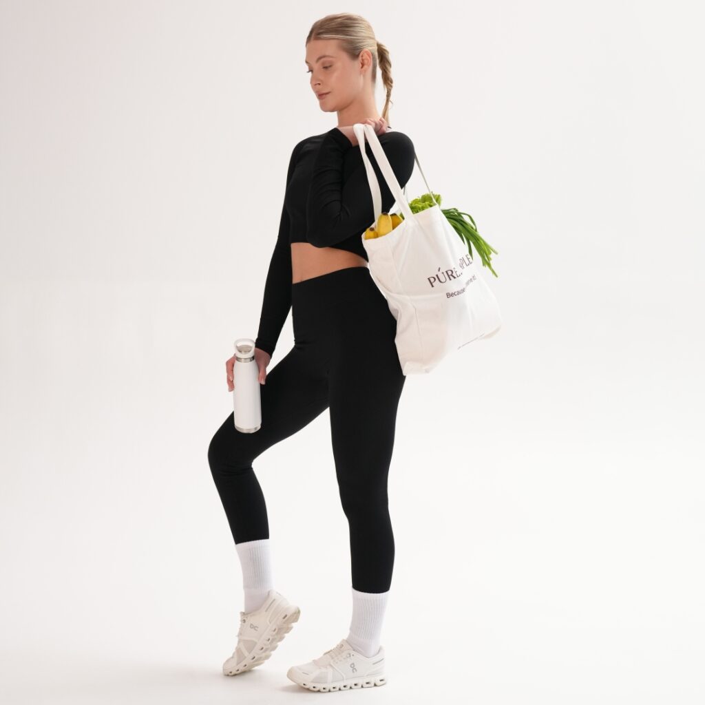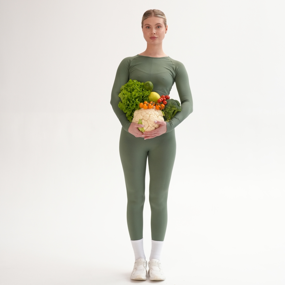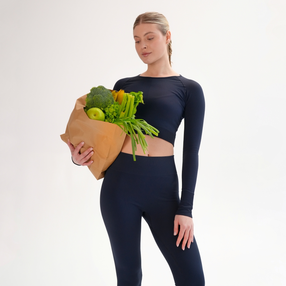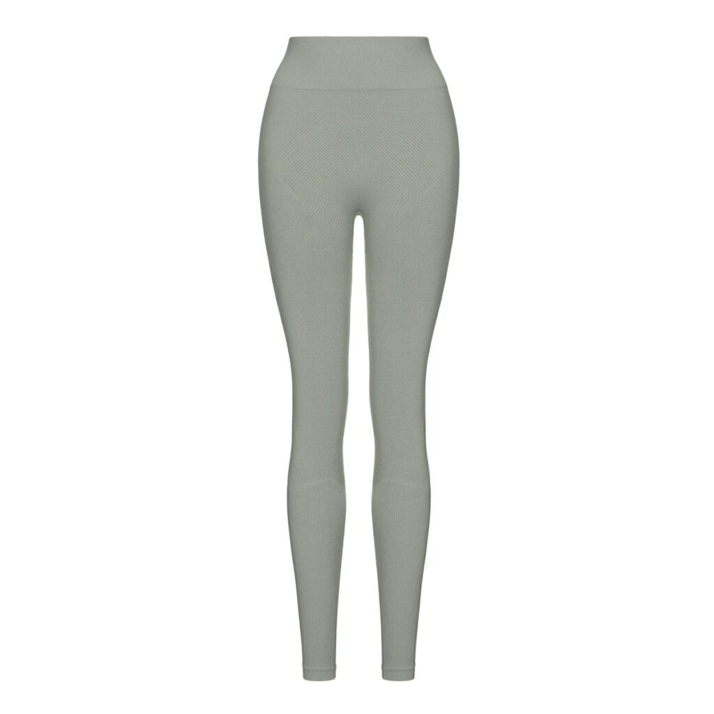 Leggings reiați pe diagonală din capsulă Rib perfection, realizați după tehnologie modernă fără cusături pe laterale. Pentru îmbunătățirea posturii, bată lată din exterior este realizată cu textură reiată și completată de o inserție triunghiulară, care îngustează vizual talia. Cusăturile exterioare sunt realizate folosind o tehnologie specială pentru a rezista suprasolicitărilor funcționale. Leggings au efect de modelare și corecție, alungind vizual picioarele și subliniind avantajele. Combinați leggings cu crop-top din aceeași capsulă și textura identică pentru look-uri monocrome sau cu crop-top din capsulă Flat harmony pentru look-uri accentuate.