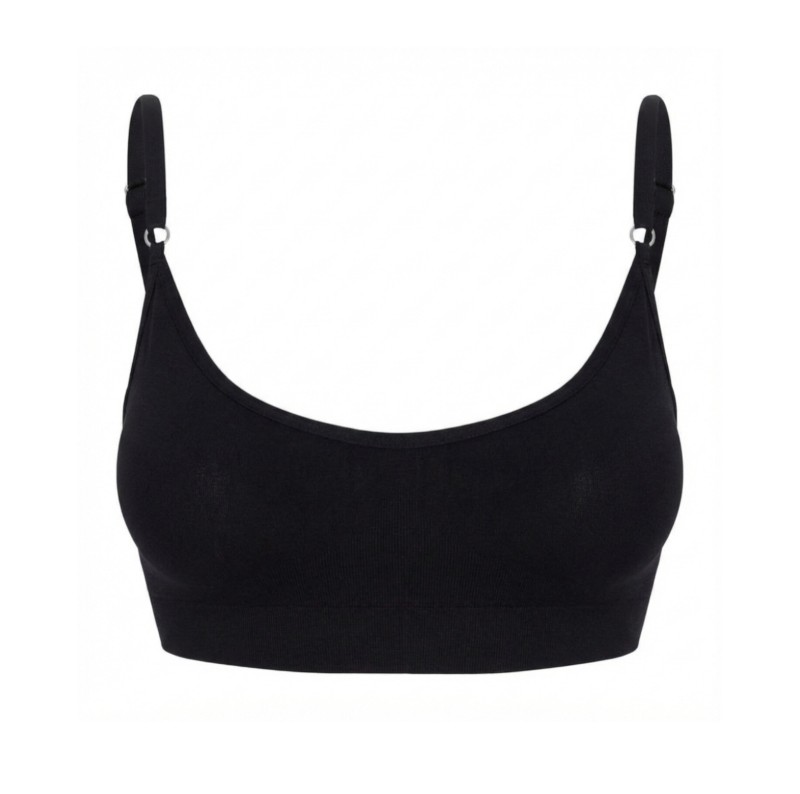 Topul pe bretele subțiri, reglabile și cupe din capsulă Basic linjerie, este confecționat din microfibră cu textură netedă, folosind tehnologie modernă fără cusături laterale. Trei rânduri de cârlige la spate permit ajustarea individuală a potrivirii topului. Bretelele reglabile permit poziționarea topului la înălțimea dorită și crearea efectului de lifting, în timp ce cupa subțire oferă formă și asigură opacitatea chiar și pentru culoarea albă. Topul a fost conceput special, ținând cont de toate nevoile și caracteristicile anatomice ale femeilor. Combinați top cu chiloți thong, brazilieni sau boxeri din aceeași capsulă pentru look-uri monocrome.