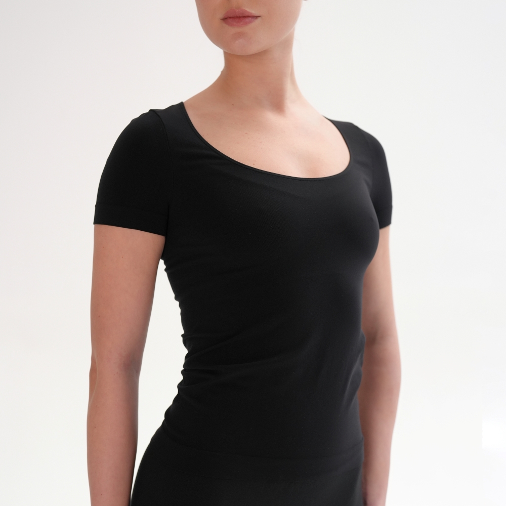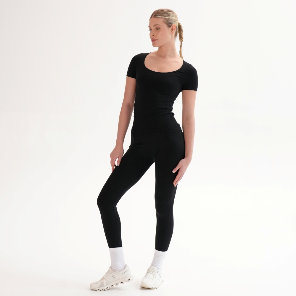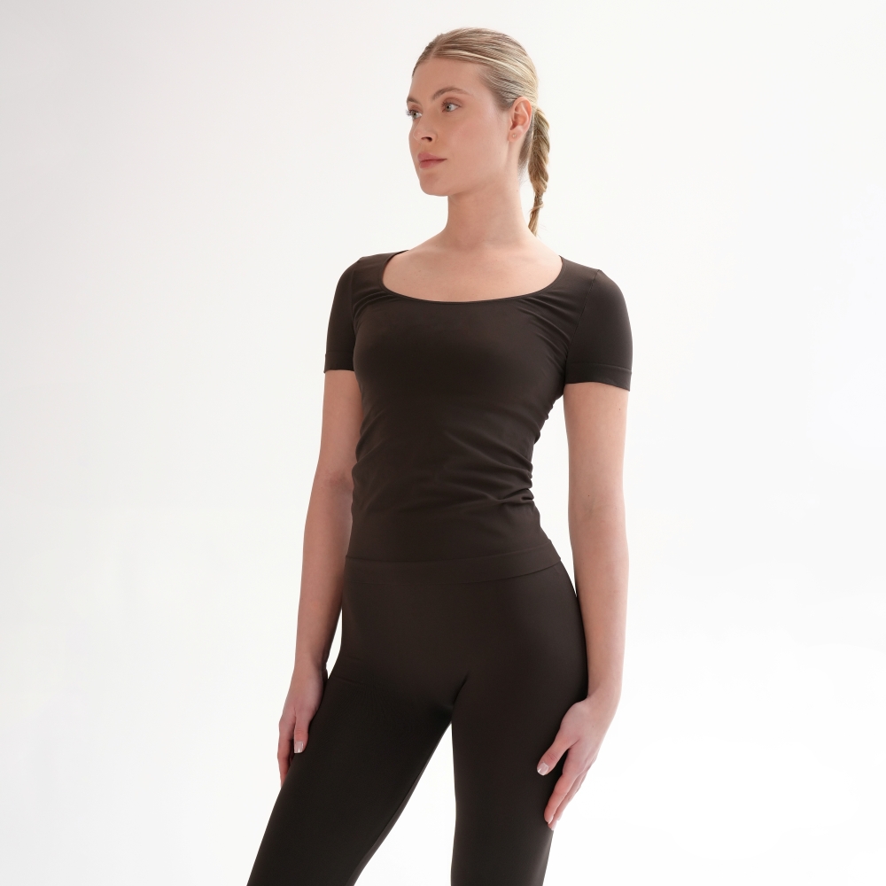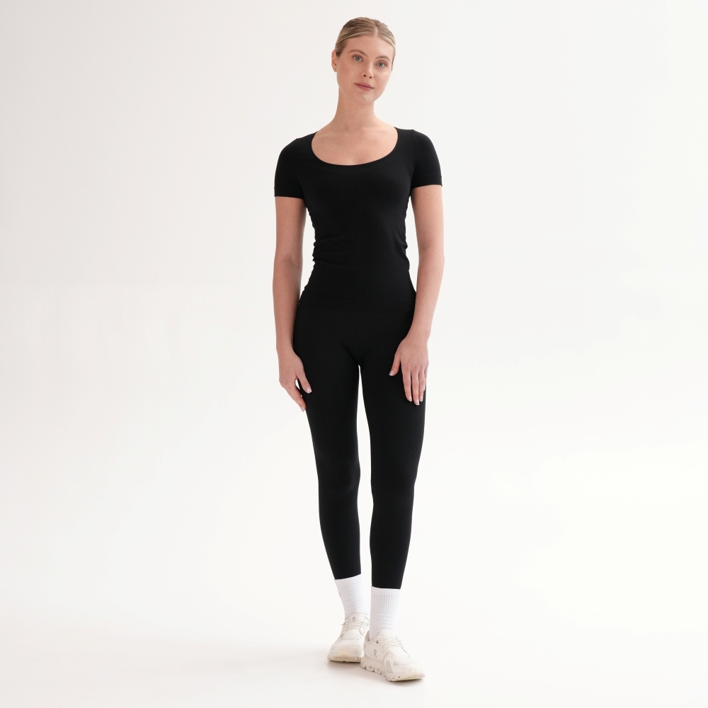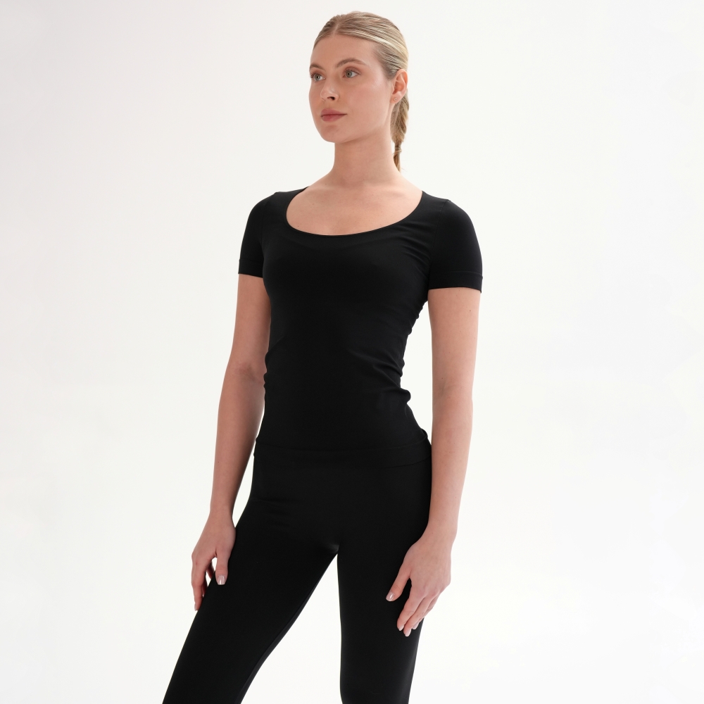 Tricoul de bază din microfibră moale și delicată îți oferă confort și lejeritate în fiecare zi. Croiala fără cusături laterale -seamless, decolteul rotund adâncit și materialul elastic care urmează linia corpului fac din el piesa esențială pentru orice garderobă. Combinaţi cu leggings din capsulele Flat Harmony pentru un look monocrom sau din Rib Perfection pentru combinații pline de stil.